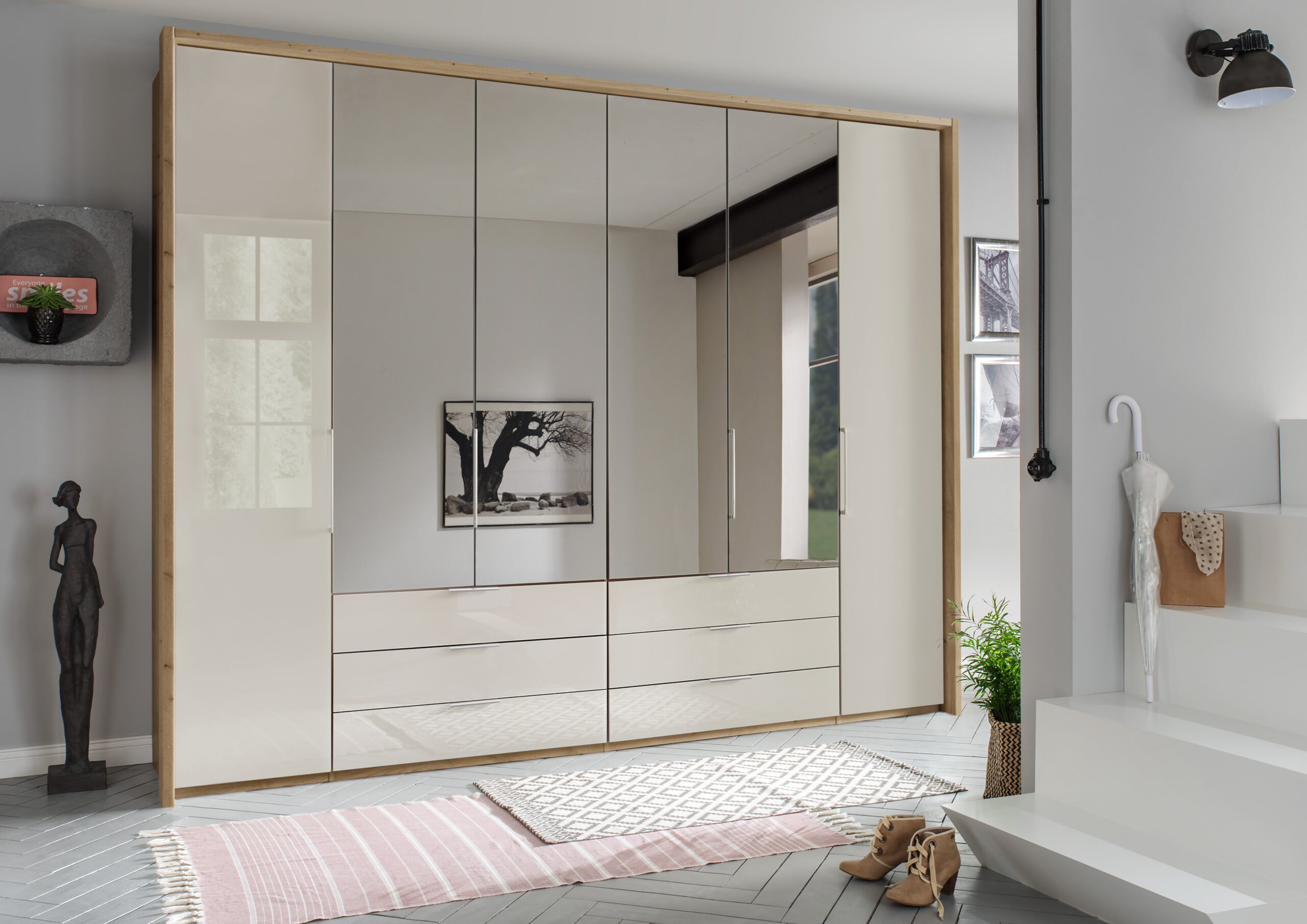 De Monaco kast is de perfecte combinatie van luxe en functionaliteit, ontworpen om elke slaapkamer of kleedkamer te verrijken. Met glanzende witte gelakte deuren straalt deze kast een moderne en elegante uitstraling uit. De kast is uitgerust met een vier spiegels. Daarnaast biedt de kast luxe lades voor het opbergen van kleding en accessoires, zodat alles overzichtelijk en binnen handbereik is. Met voldoende normale opbergruimte is de Monaco kast ideaal voor het organiseren van uw spullen, terwijl het strakke design en de luxe afwerking een verfijnde sfeer creëren. Voeg een vleugje elegantie toe aan uw interieur met de Monaco kast!
