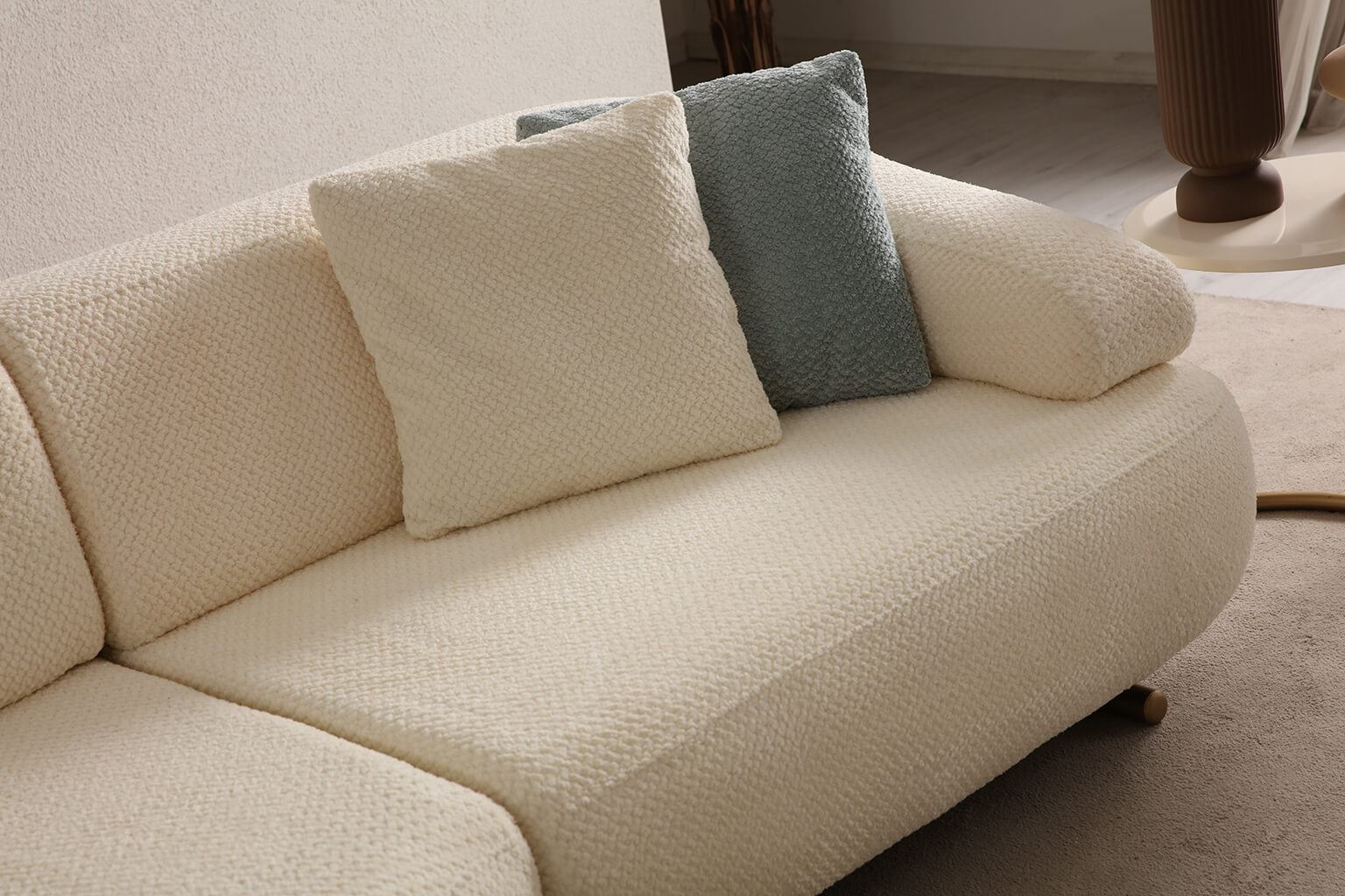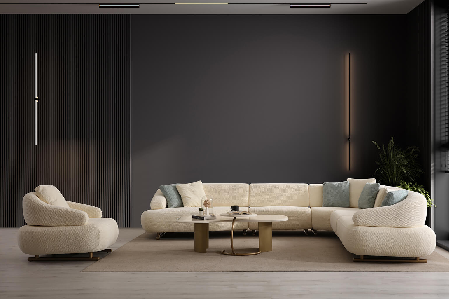 De Prada biedt een luxueuze, zwevende optiek door de combinatie van volumineuze organische vormen en elegante gouden accenten onder de basis. Dankzij de optionele houten tussenelementen creëer je met deze hoekbank een unieke en functionele lounge-ervaring met een moderne twist.